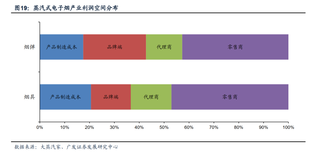 从蒸汽式电子烟产业链各部分利润分布情况来看,产品制造成本烟具制造略高于烟弹,整体制造成本略低于20%;品牌及渠道利润分成方面,在电子烟市场起步阶段,品牌方多采用让利渠道,跑马圈地的竞争策略,因此利润空间远低于零售商,约占15%左右,而渠道端分配了60%以上的产业链利润空间。
