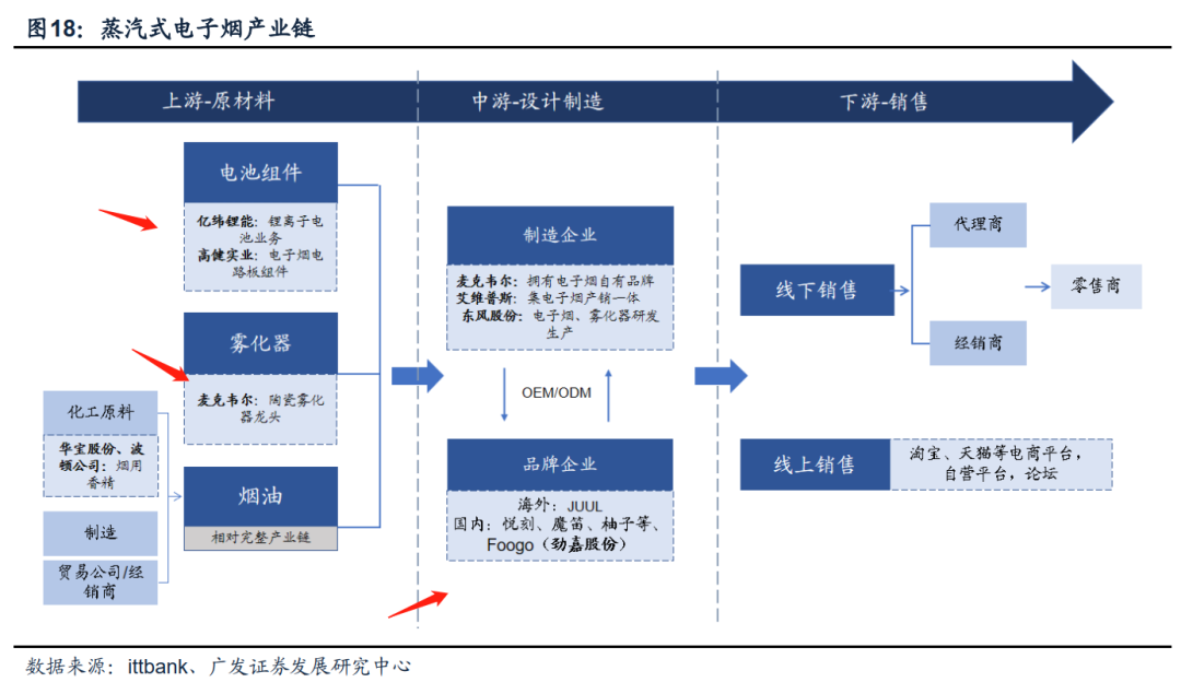 1)蒸汽式电子烟原材料主要包括电池组件、雾化器及烟油。相关上市公司,亿纬锂能为全球电子烟电池供应商,麦克韦尔为陶瓷雾化器龙头企业,国际电子烟龙头JUUL及国内电子烟悦刻、福禄、柚子等均为其下游客户。烟油方面已形成较为独立完整的产业链,其中华宝股份、波顿公司主要涉及烟用香精的生产。