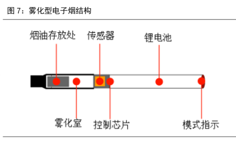 如果把电子烟的结构拆分一下,大概就是下图这个样子,比较核心的几个零部件包括芯片、锂电池和雾化器,但是技术含量其实也都不是很高,整个产业链国内和国外都有成熟的企业在做,国内和国外的技术也都差不多。