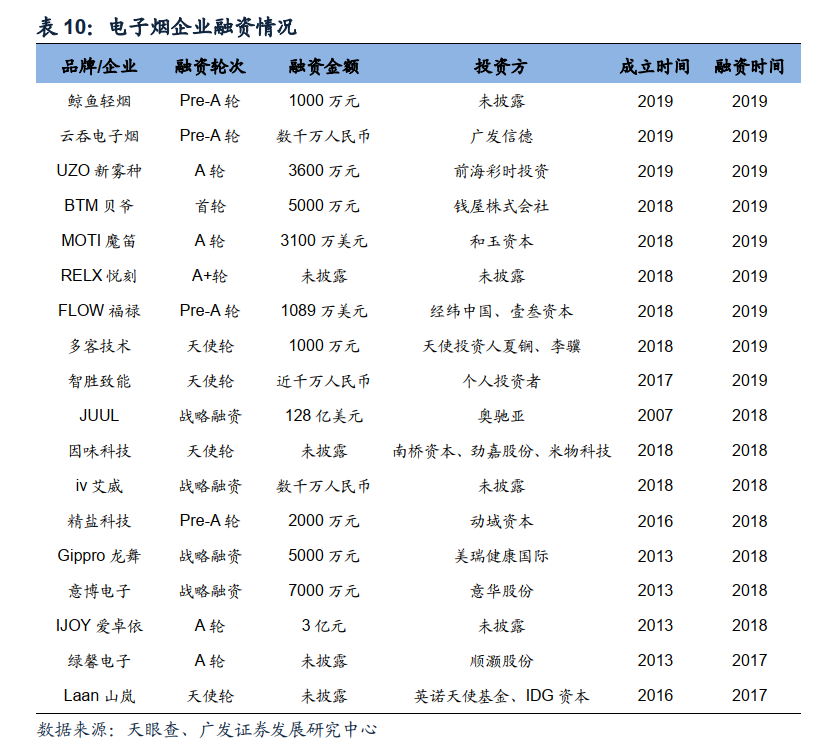 3)销售渠道线下为主,线上为辅。海外巨头JUUL前期主要通过社交媒体推广电子烟,打造品牌认知,结合线上线下销售;国内品牌在前期消费者认知培育阶段,主要以线下体验店为主,通过代理商、经销商模式销往零售终端,线上通过各大电商平台、自营平台及论坛等进行销售。